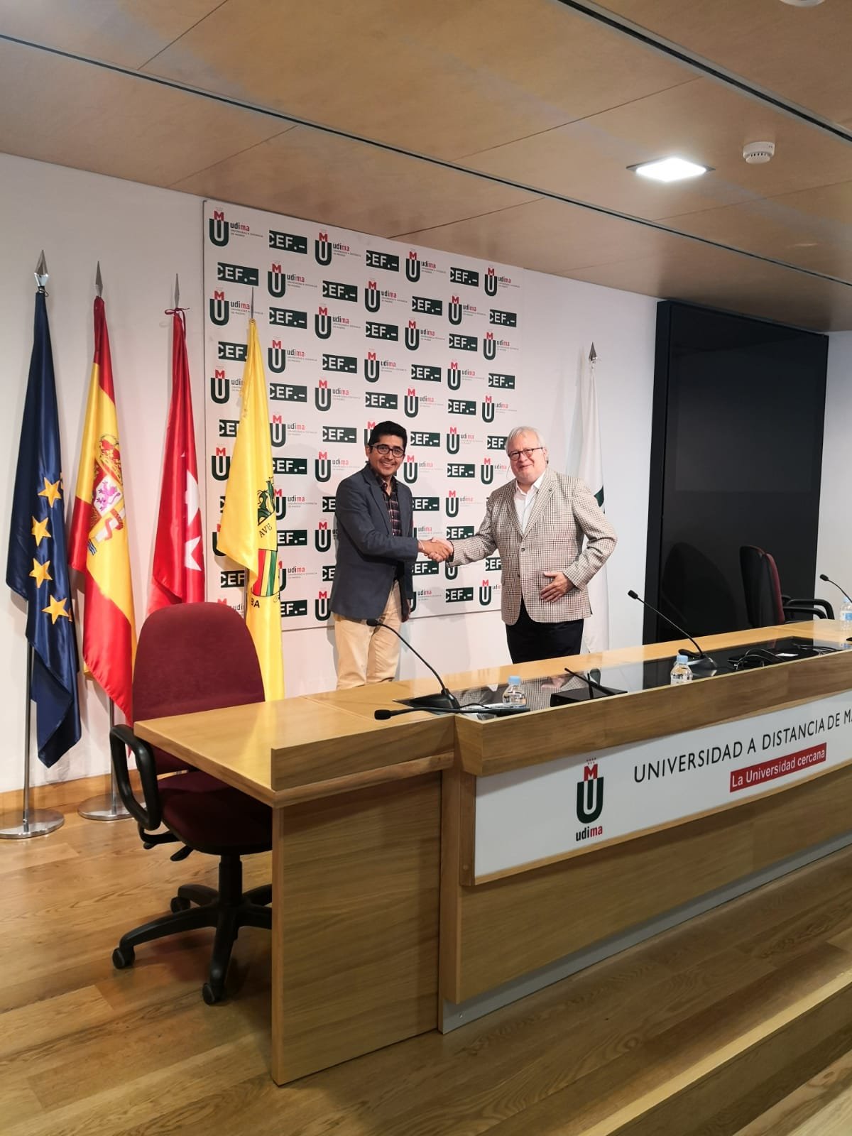 Durante su visita a España, Lizarraga Guerra mantuvo también un encuentro informal con Arturo de las Heras, presidente del Grupo Educativo CEF.- UDIMA, en la sede de la institución académica en Madrid capital.