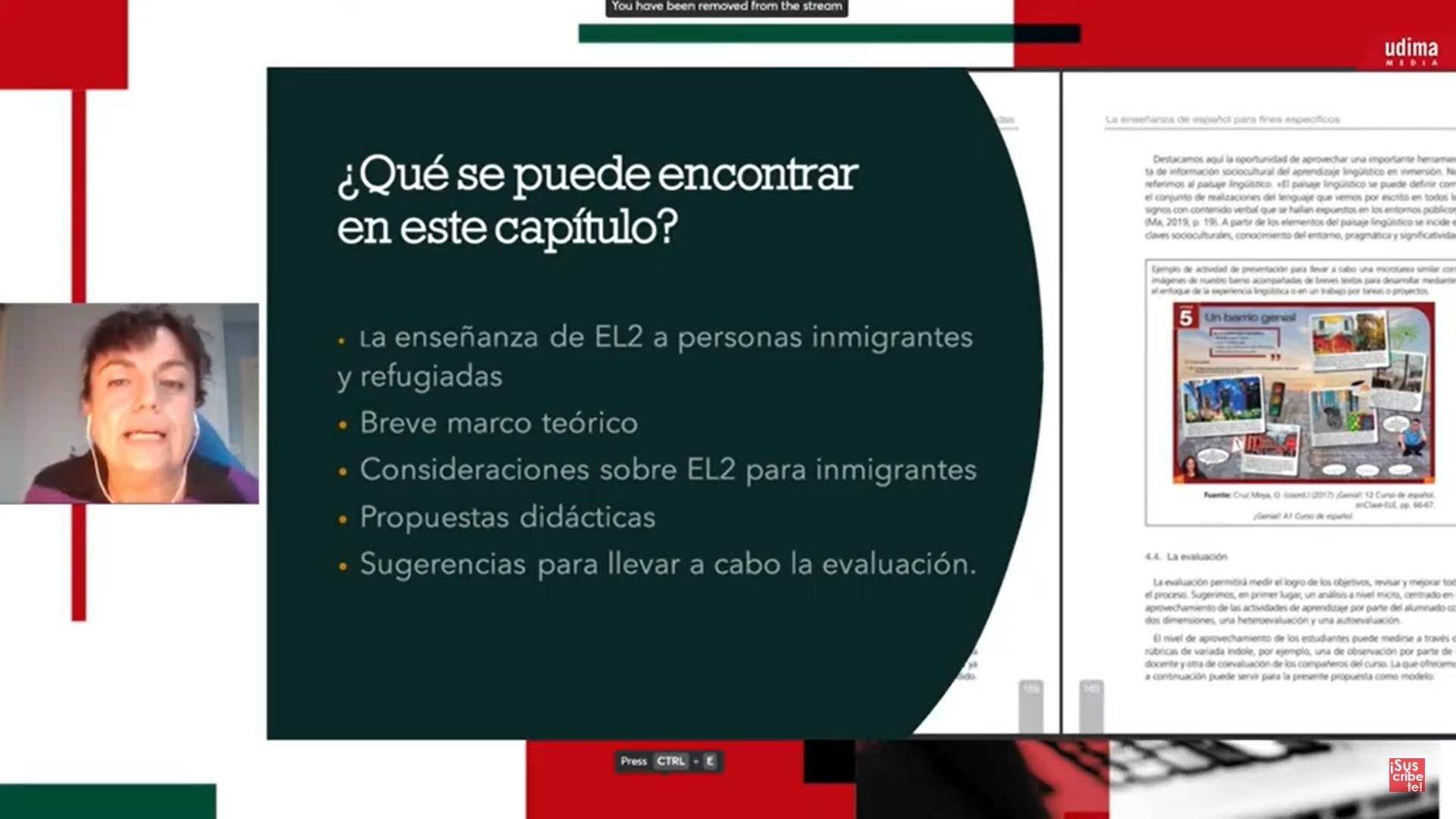 ‘La enseñanza del español de la salud: la integración del componente pragmático y lingüístico’ comprende el Capítulo 4, por cuenta de Marta Gancedo y Rubén Pérez, quienes por medio de una grabación explicaron su aportación, enfocada especialmente en la integración del componente pragmático y lingüístico.