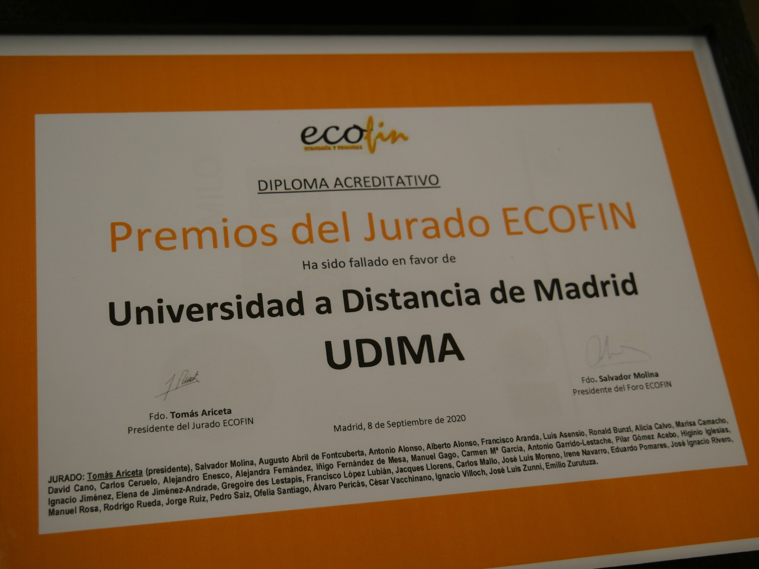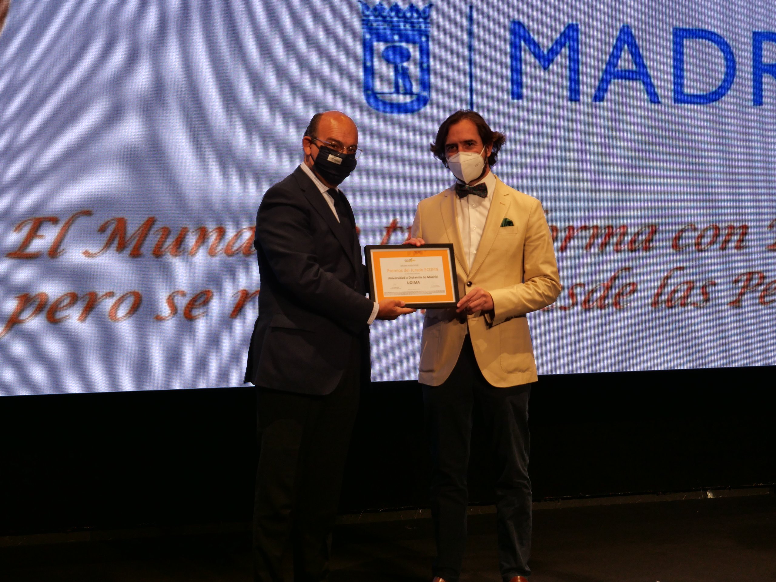 El Foro ECOFIN ha reconocido a la Universidad a Distancia de Madrid, UDIMA, con el Premio del Jurado ECOFIN 2020. Recogió el galardón este martes Arturo de las Heras, presidente del Grupo Educativo CEF.- UDIMA, por "la respuesta de la UDIMA frente a la COVID-19: know how humano y tecnológico al servicio de la sociedad". El secretario general de la Asociación Nacional de Escuelas de Negocios, Jorge Ruiz, le entregó el premio durante La Noche de las Finanzas, celebrada en La N@ve de Madrid.